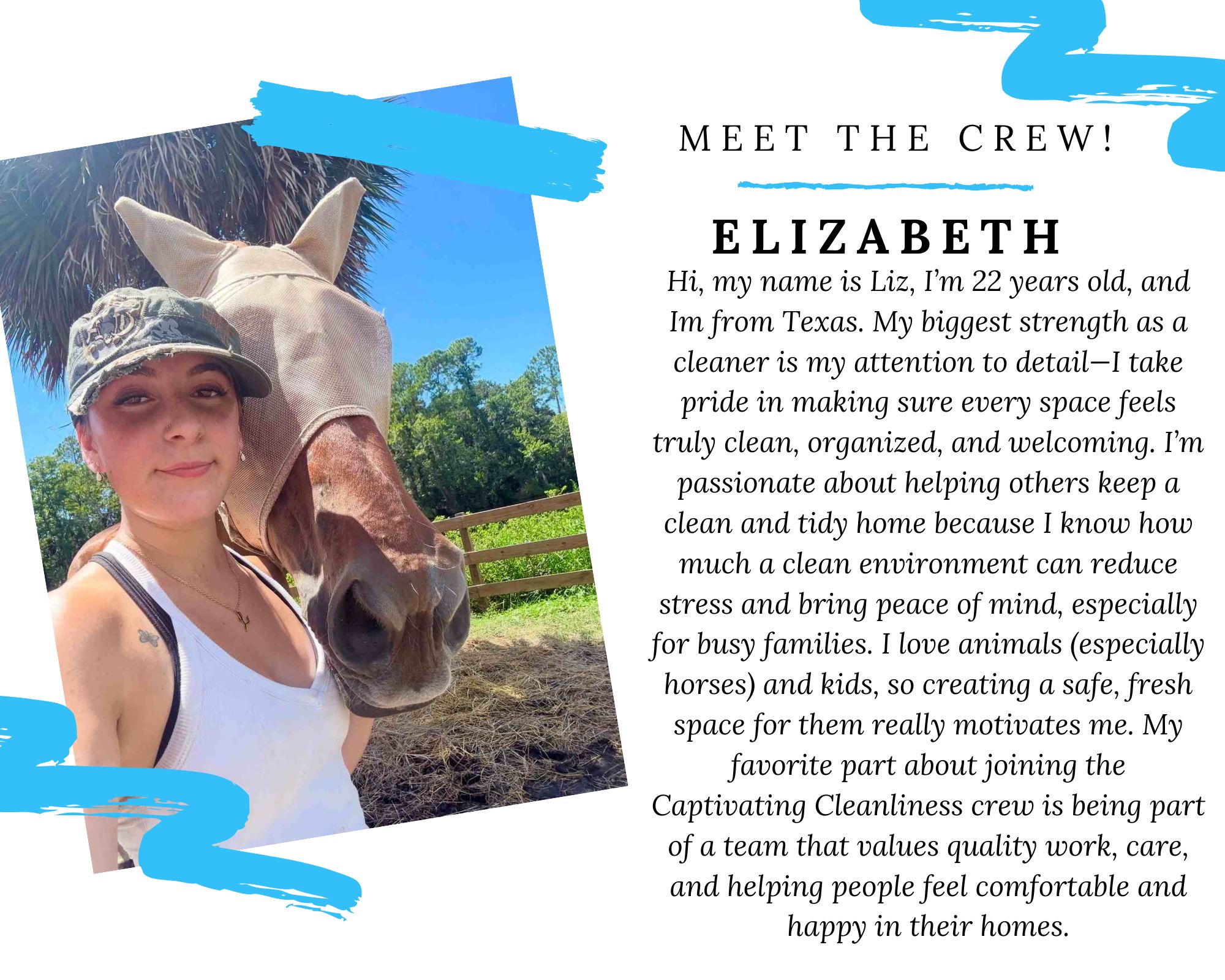 As the CEO of Captivating Cleanliness, Lindsay is deeply involved in every facet of the business. Whether it’s connecting with her team, attending local networking events, participating in coaching and mentorship programs, or giving back to the community, she’s committed to making sure everyone who interacts with Captivating Cleanliness—clients, employees, and neighbors alike—feels supported, appreciated, and truly cared for.